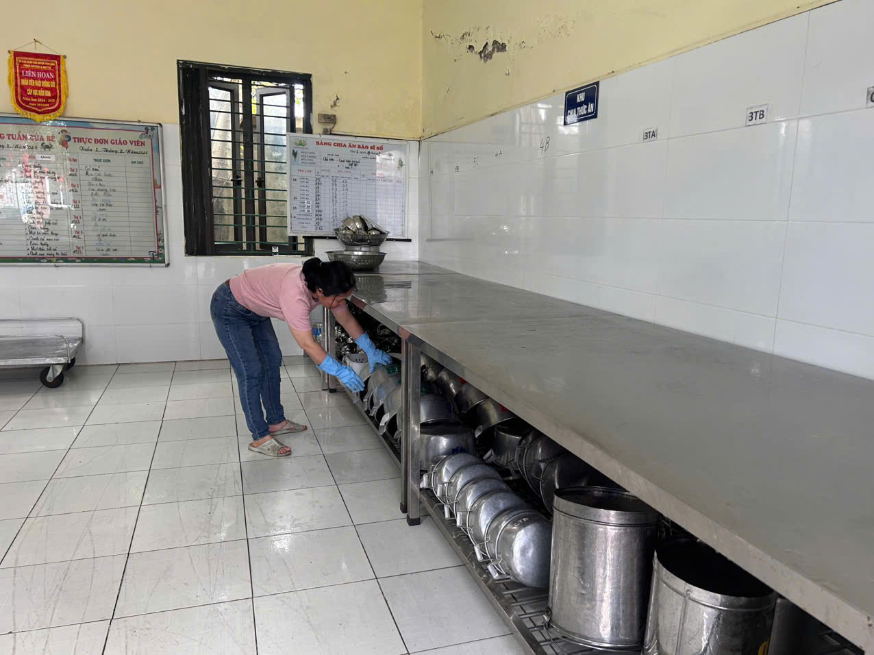 Tổng vệ sinh toàn bộ khu chế biến, khu sơ chế, khu chia ăn; lau rửa sàn nhà, tường, bàn inox, hệ thống bếp ga – tủ nấu cơm.