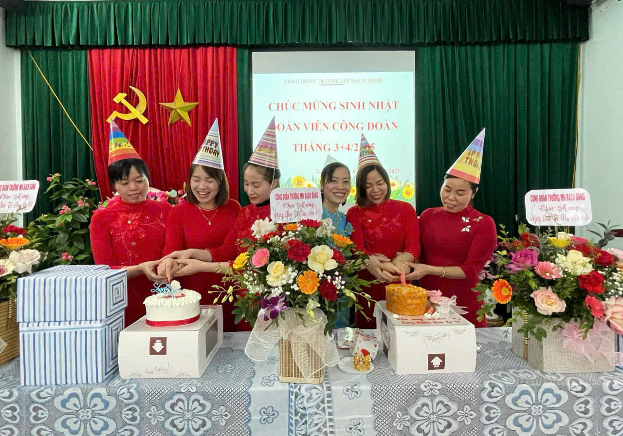 Chiều ngày 07/03/2025, Công đoàn trường Mầm non Bạch Đằng đã tổ chức chúc mừng sinh nhật các đoàn viên công đoàn có sinh nhật trong tháng 03, 04. Đây là một việc làm thiết thực nhằm quan tâm, chăm lo đời sống vật chất và tinh thần cho công đoàn viên, góp phần thực hiện nếp sống văn minh và xây dựng đời sống văn hóa trong nhà trường.Thông qua chương trình sinh nhật cũng là cơ hội để Đoàn viên công đoàn sum vầy bên nhau, tâm sự, chia sẻ những vui buồn trong cuộc sống và những kinh nghiệm trong công tác giảng dạy.
