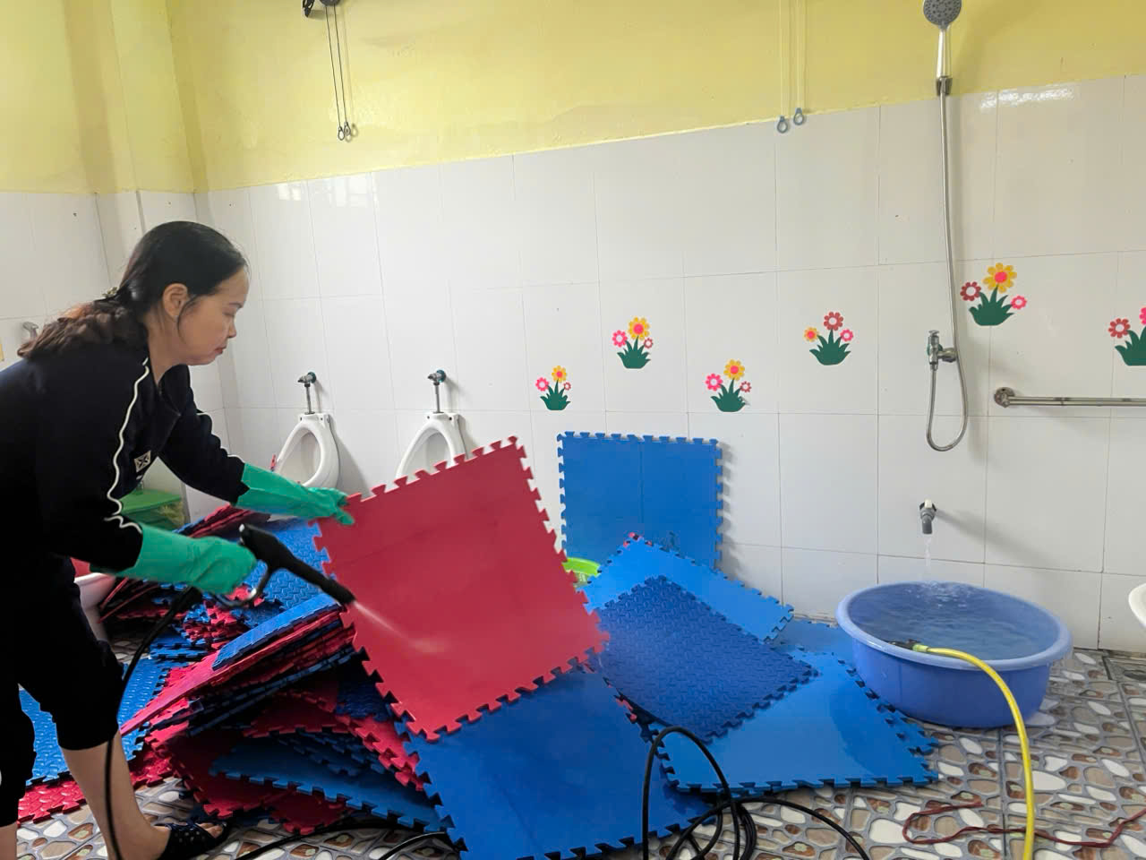 Tổng vệ sinh, khử khuẩn toàn bộ phòng học, hành lang, khu vui chơi.
