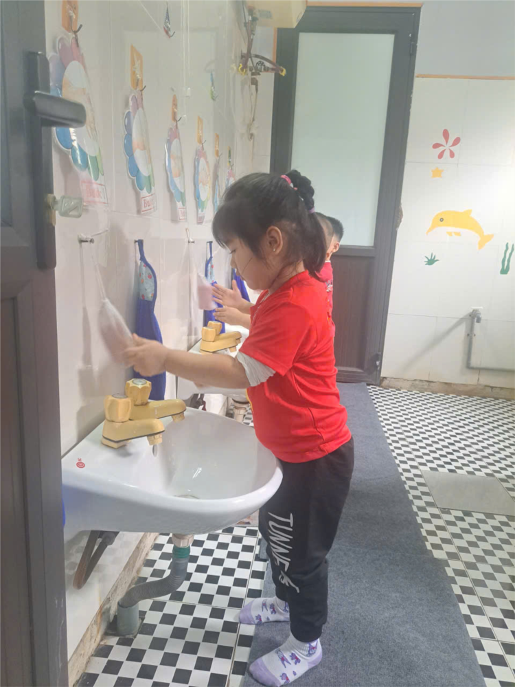 Dưới sự hướng dẫn tận tình của cô, các con biết xắn tay áo gọn gàng, mở vòi nước, xoa xà phòng và rửa thật kỹ từng ngón tay, khuôn mặt để luôn sạch sẽ, thơm tho. Những giọt nước long lanh, tiếng cười giòn tan và gương mặt rạng rỡ sau khi rửa tay khiến không gian lớp học thêm tươi vui, trong lành. 🌼