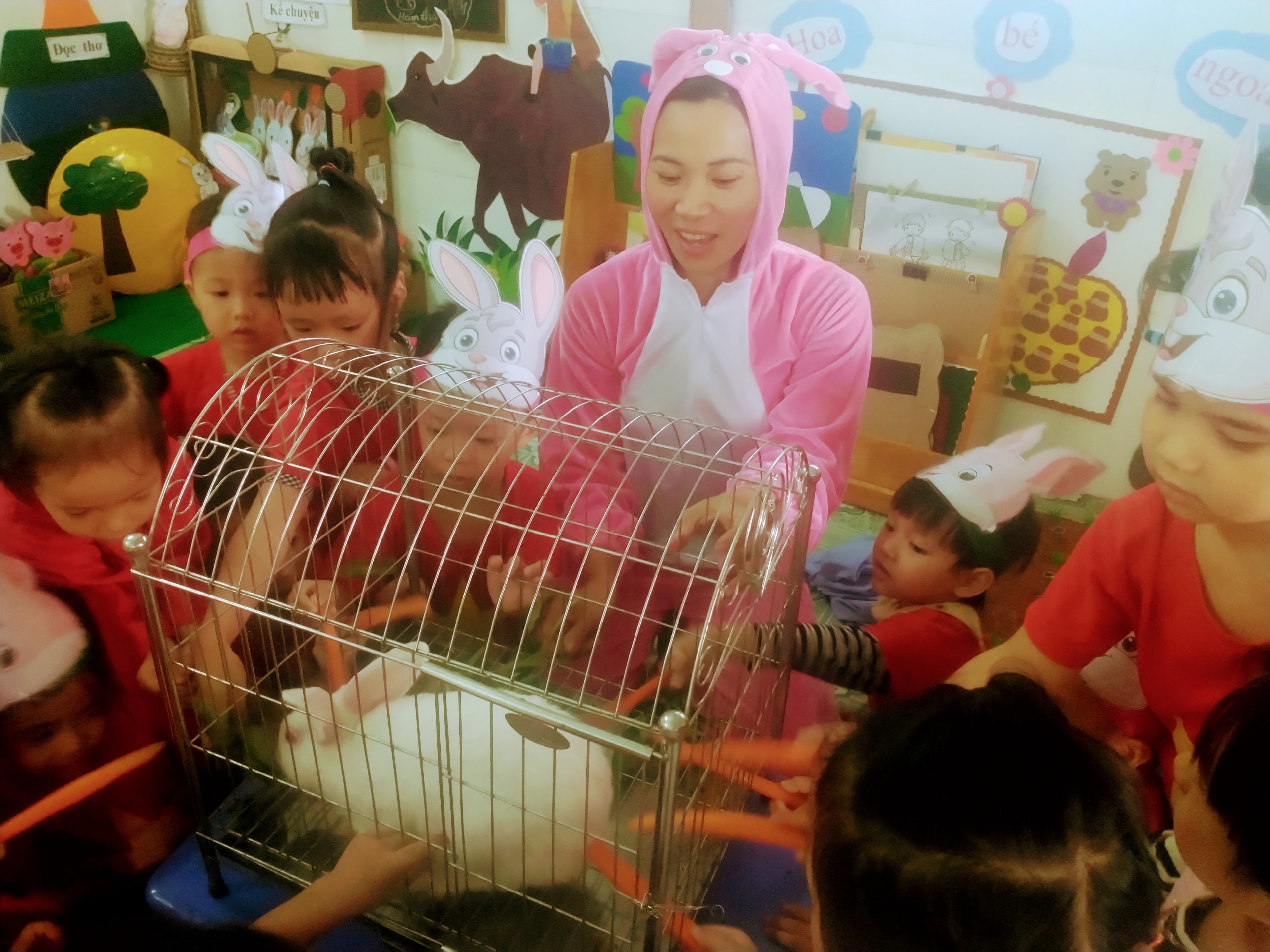 Trẻ tham gia nhiệt tình cho thỏ ăn rau và cà rốt