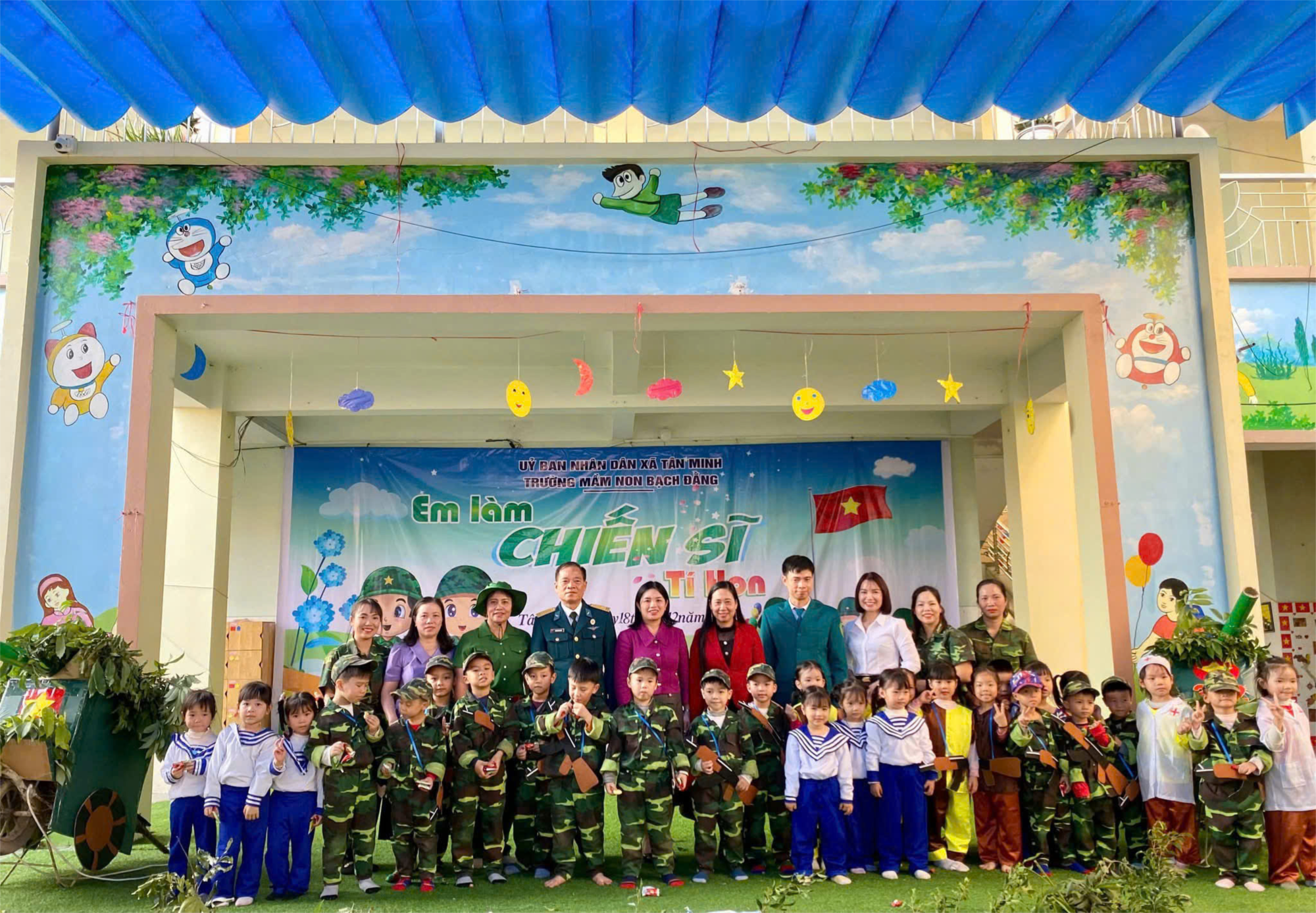 Tham dự chương trình, nhà trường vinh dự được đón đồng chí Nguyễn Thị Bích Huyền - Ủy viên BTV Đảng ủy, Phó Chủ tịch Thường trực UBND xã Tân Minh; đồng chí Vũ Văn Thuật – Ủy viên BTV Đảng ủy, Chỉ huy trưởng Ban Chỉ huy Quân sự xã; đồng chí Nguyễn Văn Cành – Chủ tịch Hội Cựu chiến binh xã; đồng chí Hoàng Thị Hương - Trưởng phòng Văn hóa xã hội xã, Ban đại diện Hội cha mẹ học sinh cùng tập thể cán bộ, giáo viên, nhân viên nhà trường và đông đảo phụ huynh học sinh cùng các chiến sĩ tí hon Trường MN Bạch Đằng.