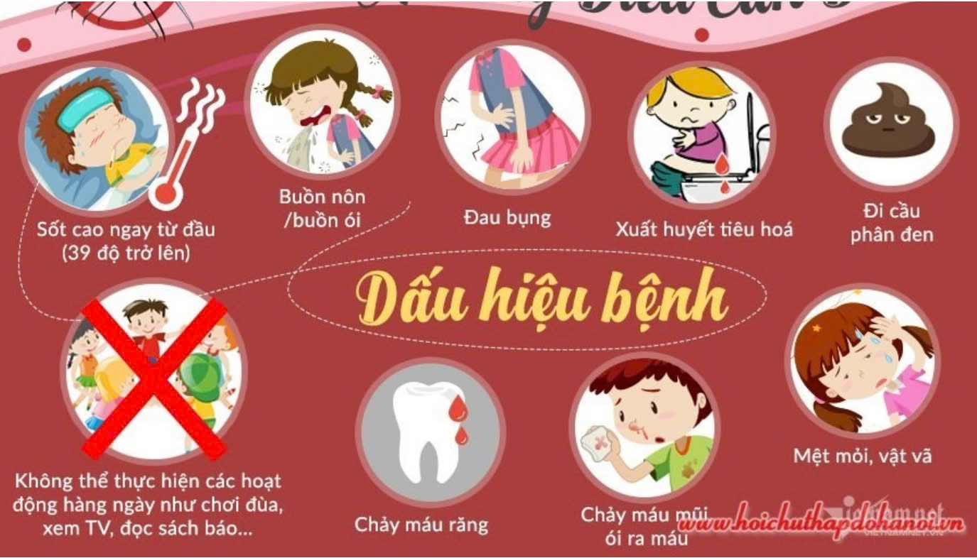 - Dấu hiệu xuất huyết: chấm xuất huyết ngoài da, chảy máu chân răng, vết bầm chỗ tiêm, nôn ra máu, đi ngoài phân đen,…
