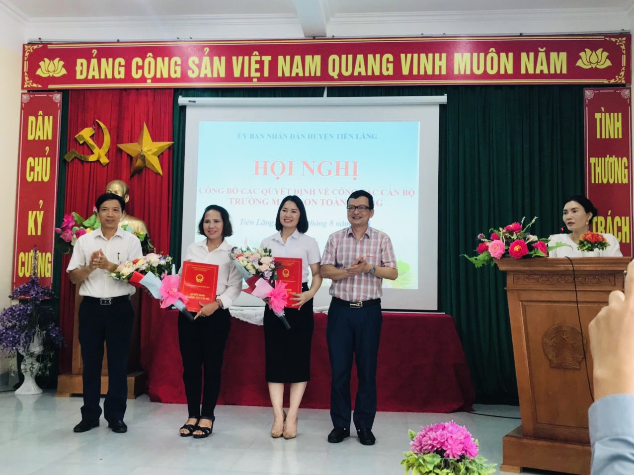 Chiều 5-8, UBND huyện Tiên Lãng tổ chức công bố, trao Quyết định điều động, luân chuyển cán bộ quản lý các trường học tại trường Mầm non Bạch Đằng. Về dự và chủ trì Hội nghị có Đồng chí Bùi Thành Cương, Phó BT Huyện uỷ- Chủ tịch UBND huyện; cùng các đồng chí lãnh đạo Phòng Nội vụ, Phòng Giáo dục và đào tạo, các đồng chí lãnh đạo địa phương. Cùng tập thể CB-GV-NV trường Mầm non Bạch Đằng.
