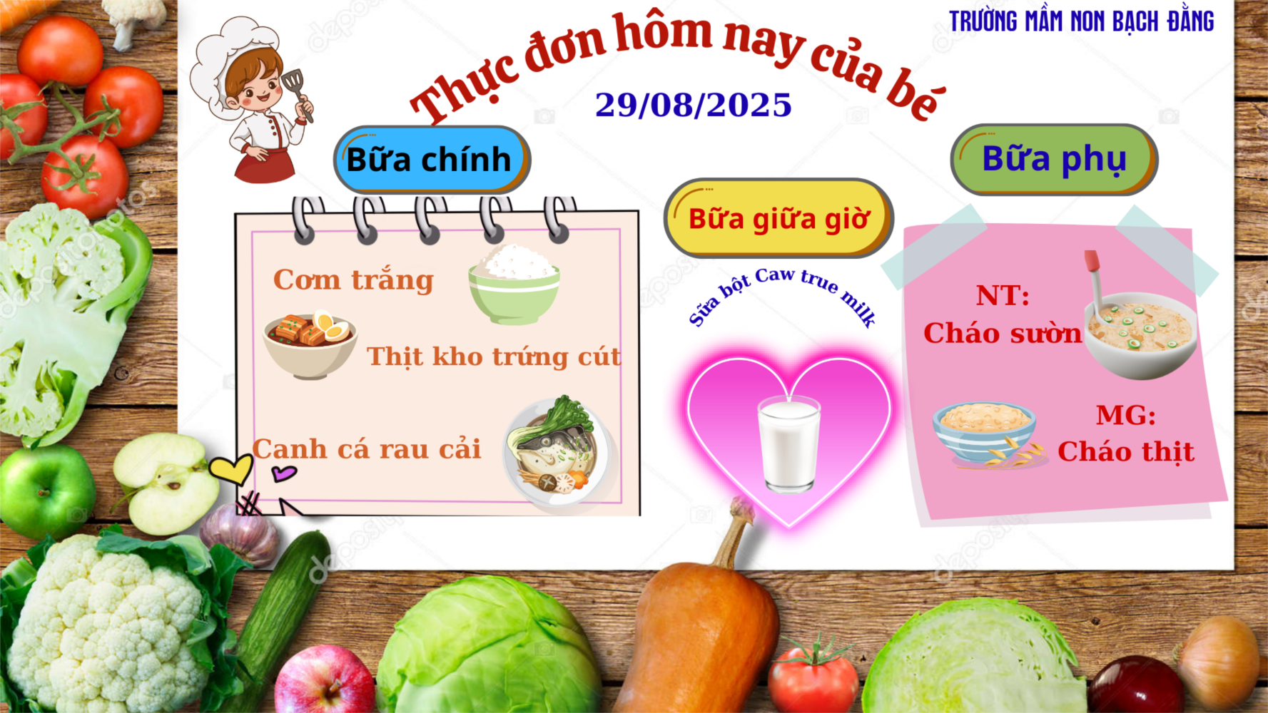 nhà trường chuẩn bị cho các bé một thực đơn đầy đủ dinh dưỡng, đảm bảo vệ sinh